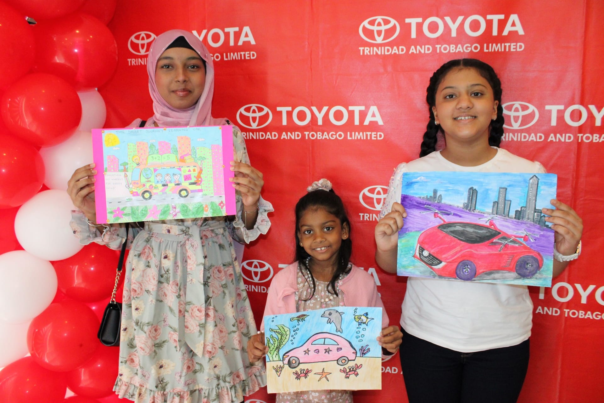 From left to right: Faryal Ali with the Smart Journey Learning Car (Winner of the 12 to 15 Category); Renaiya Arjoon with the Ocean Safari Car (Winner of the Under 7 Category) and Charisma Rasiah with The Ultimate Total Toyota (Winner of the 8-11 Category).